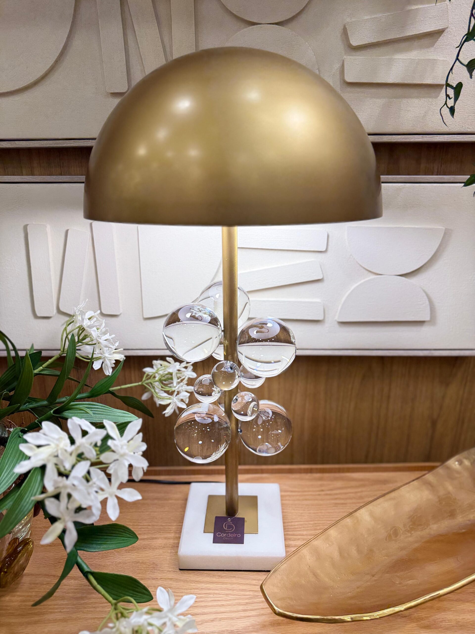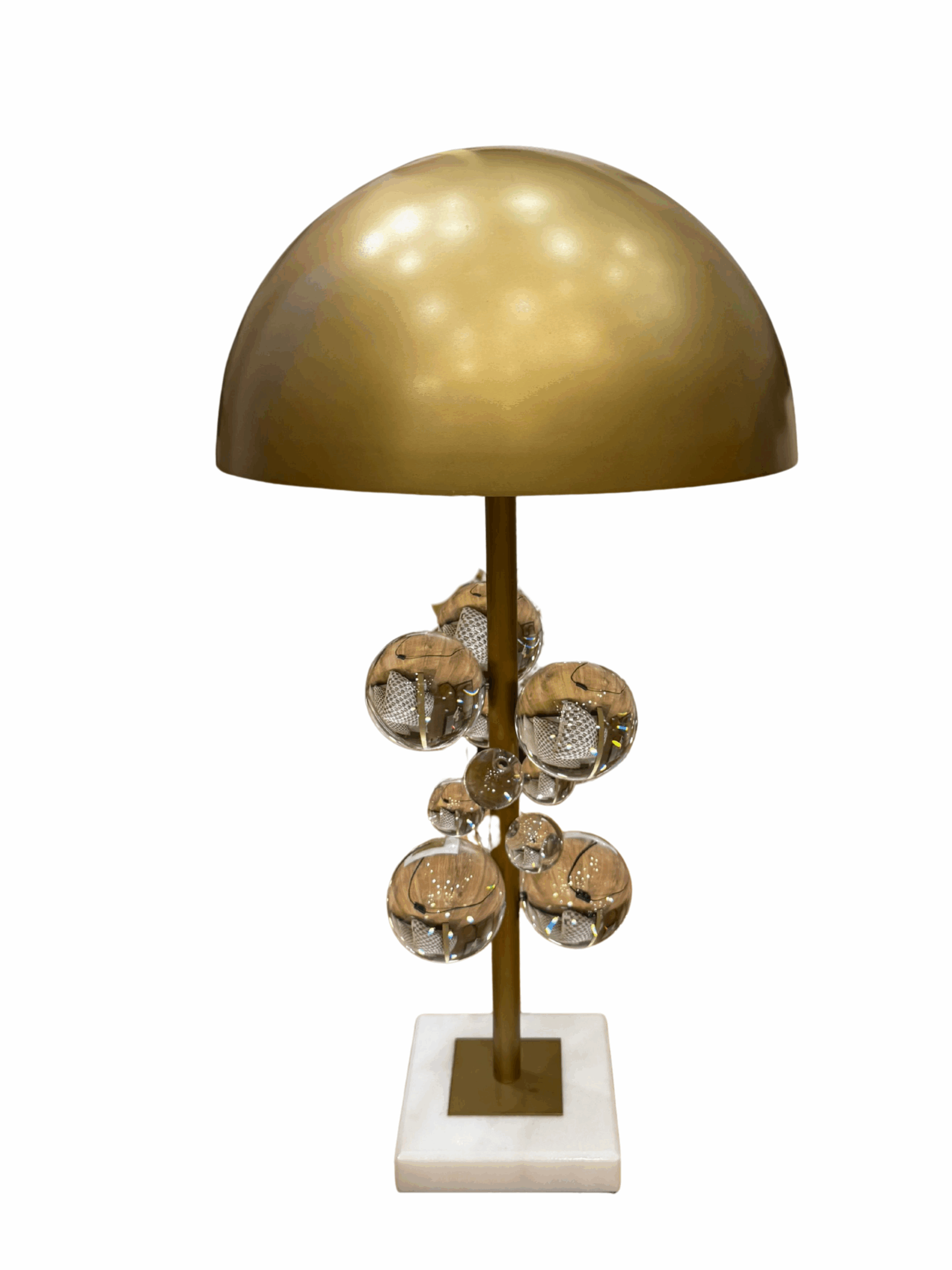 Esse abajur é muito mais que uma fonte de luz: é uma peça de destaque. Seu design combina uma cúpula metálica dourada com um corpo decorado por esferas de cristal translúcido que remetem a bolhas, criando um efeito sofisticado e leve ao mesmo tempo. A base em mármore completa o conjunto com um toque de solidez e requinte. Ideal para ambientes que pedem charme contemporâneo e iluminação acolhedora.
