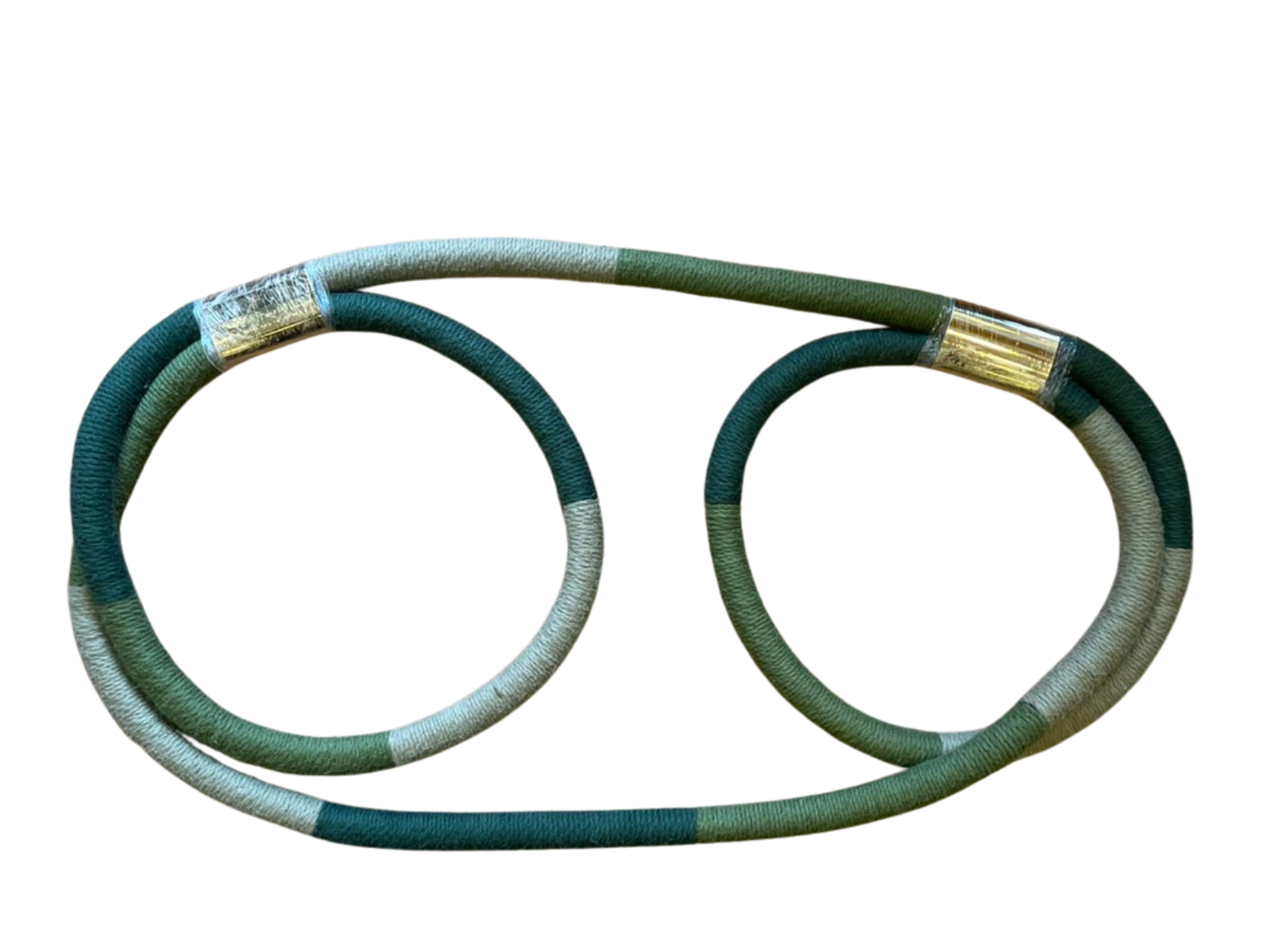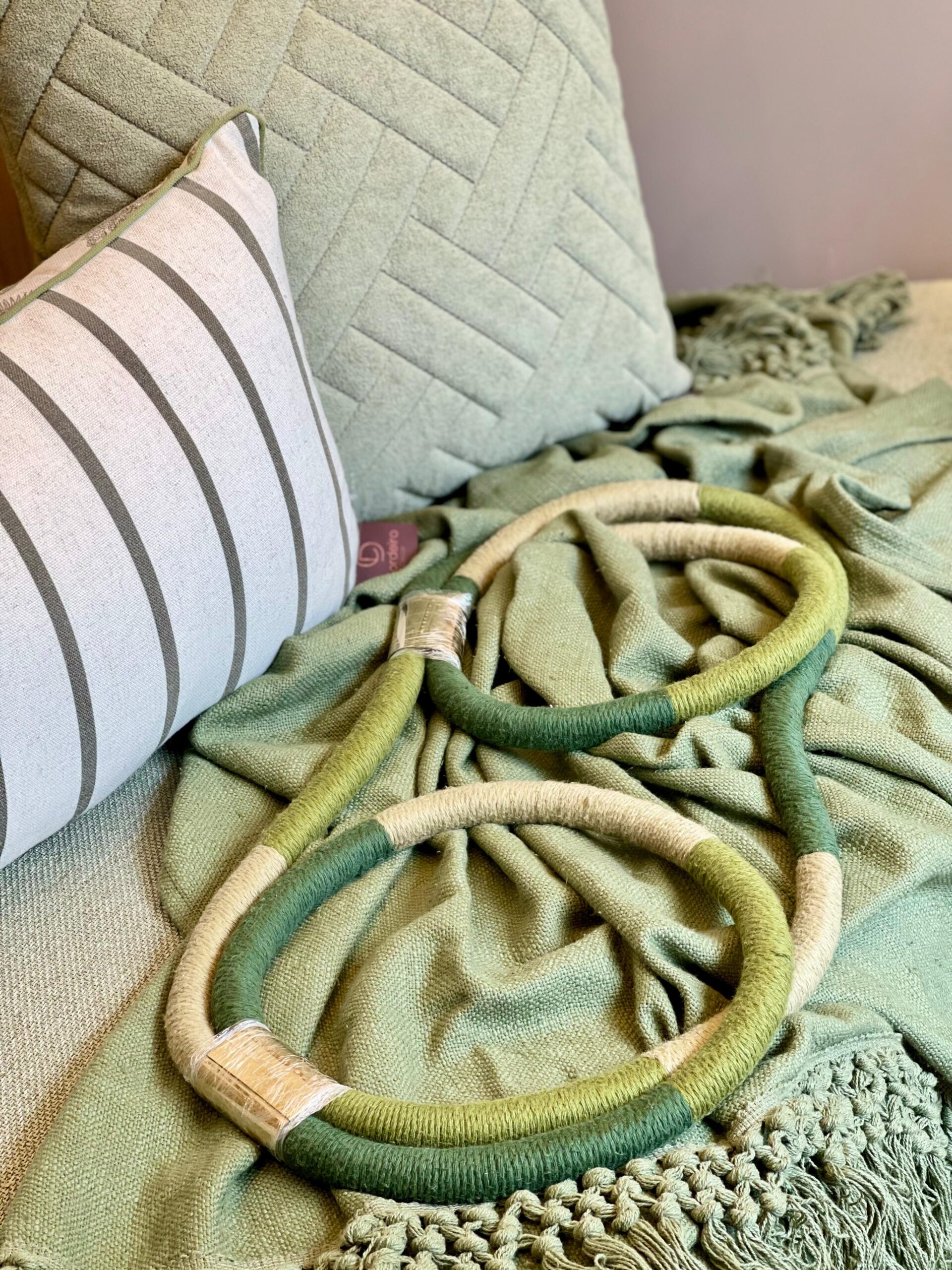 O Colar Tecido Verde com Detalhes em Dourado é uma peça autêntica que une simplicidade e sofisticação. Revestido em fios de tecido em tons de verde, traz frescor e leveza, enquanto os detalhes dourados adicionam brilho e elegância à composição. Versátil, pode ser usado como objeto decorativo em composições criativas ou como acessório marcante, revelando o equilíbrio perfeito entre artesanal e contemporâneo.
