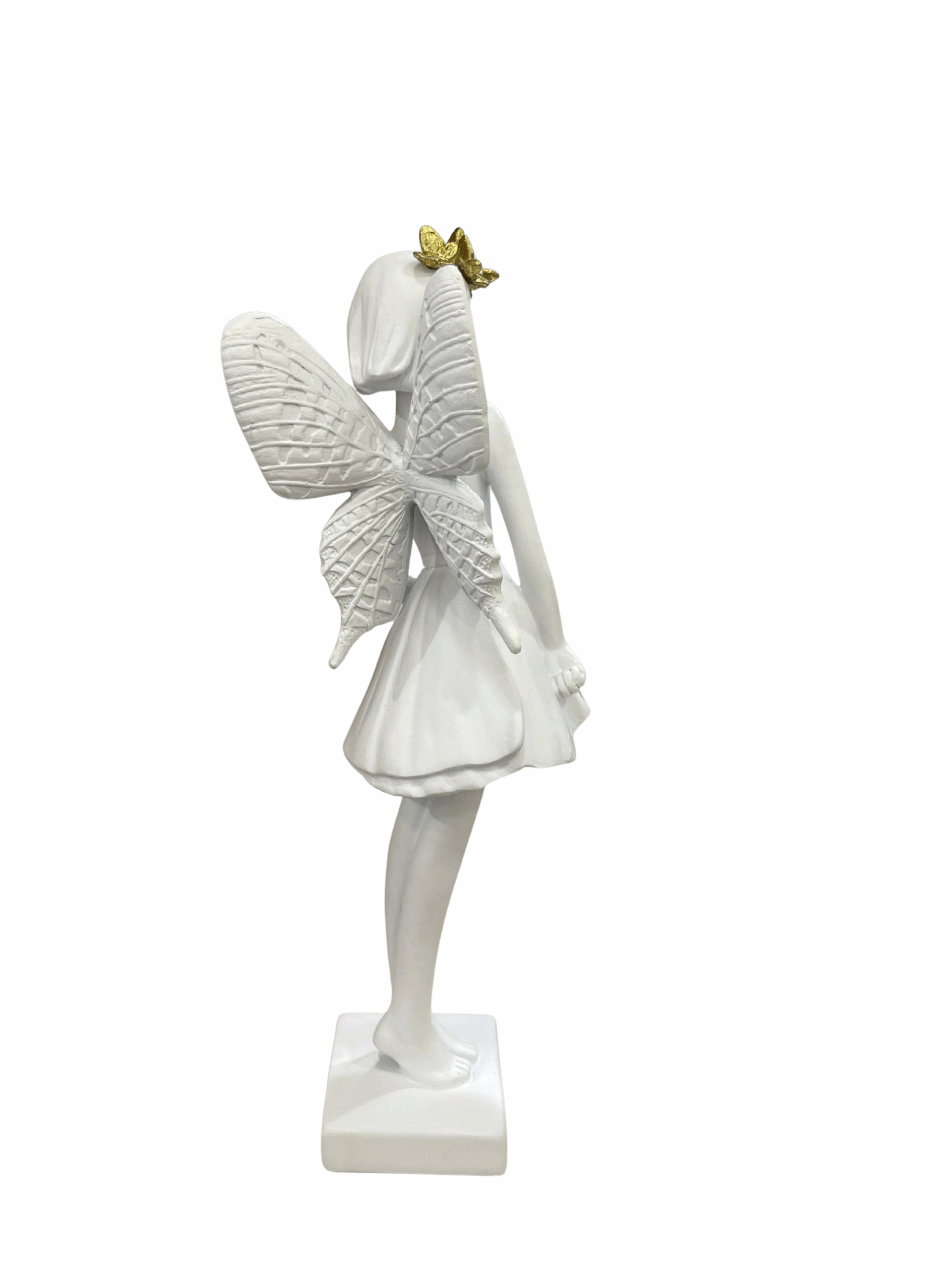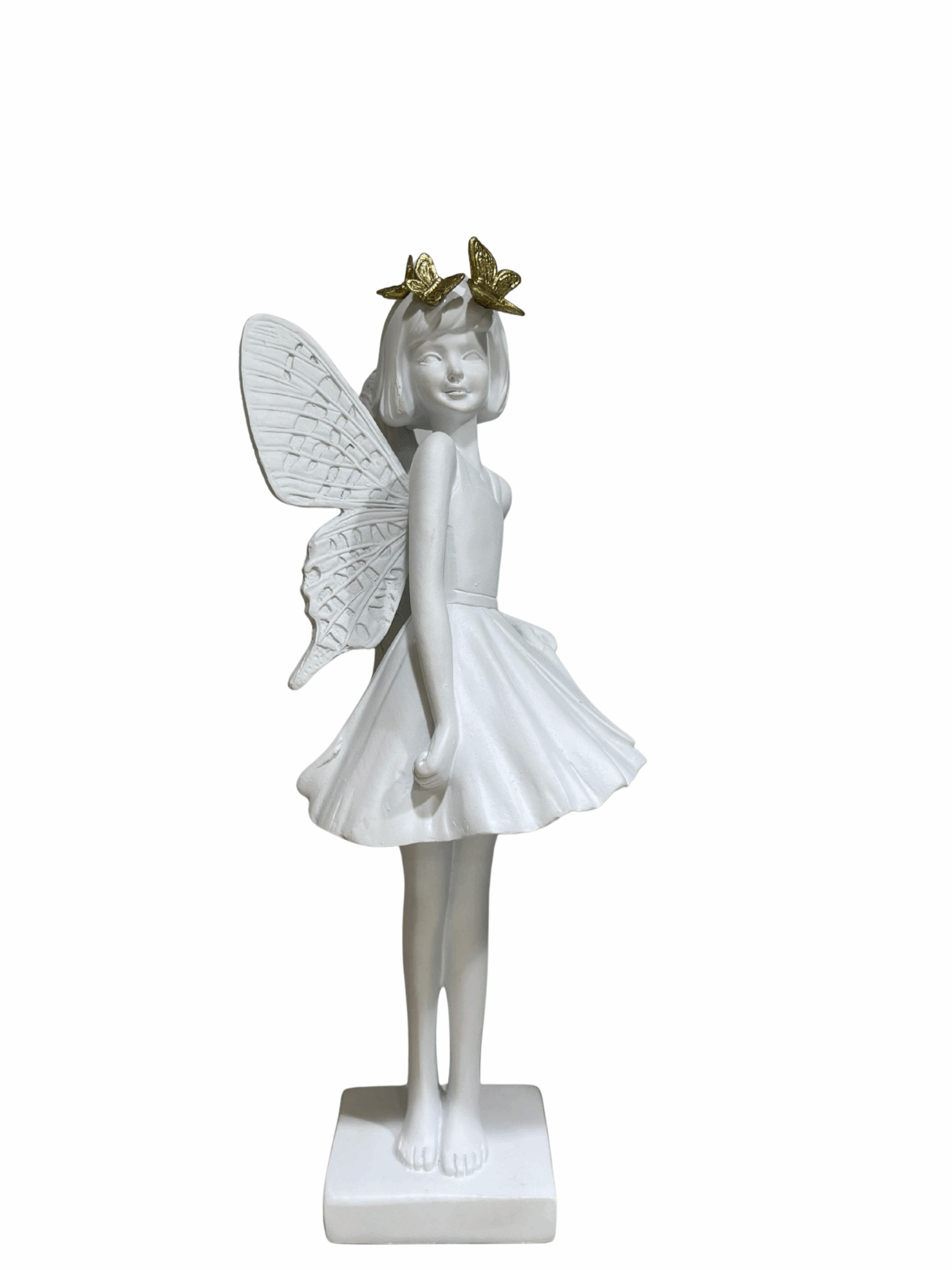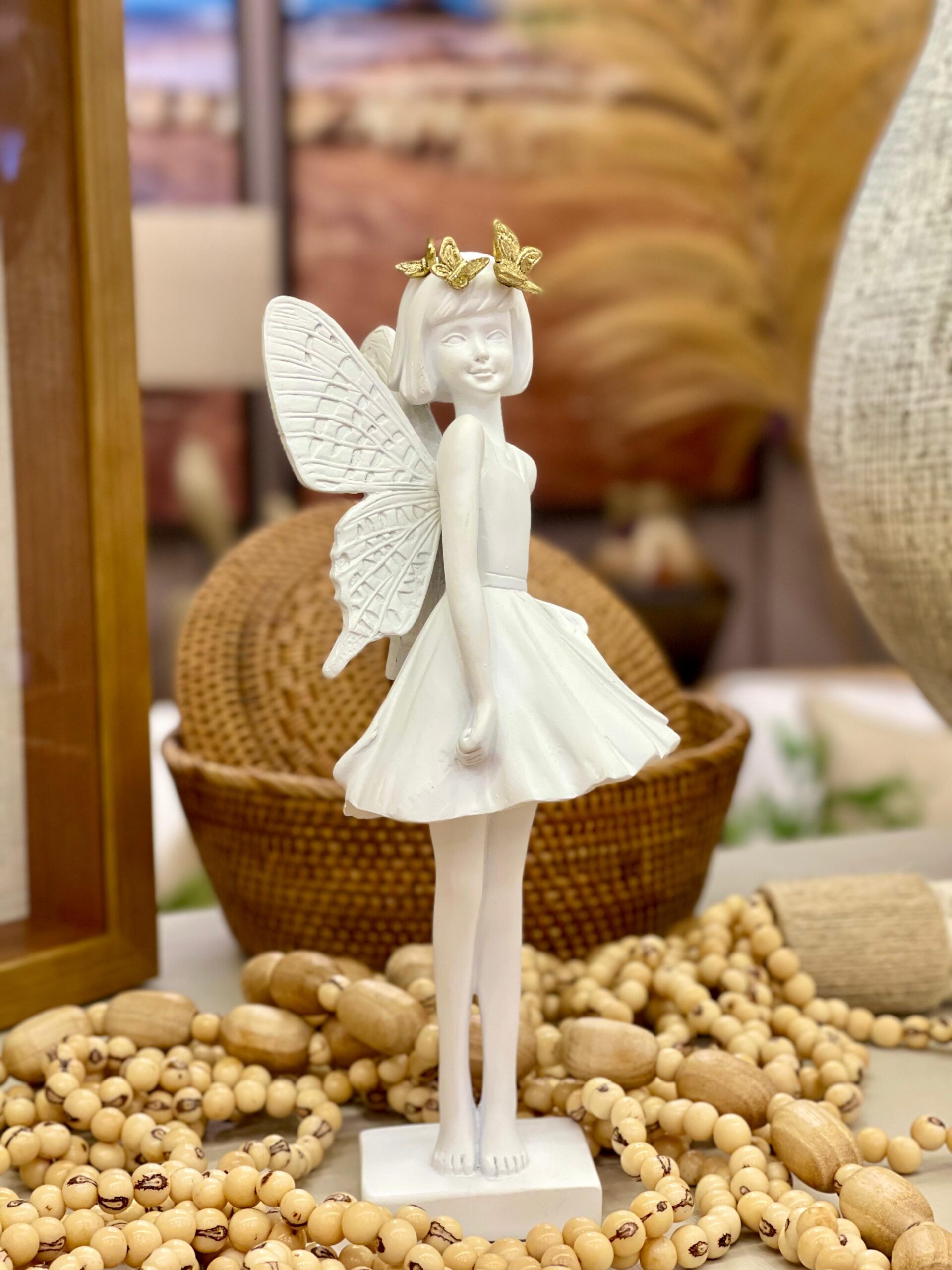 A escultura da fada delicada transmite encanto e suavidade em cada detalhe. Com asas texturizadas, vestido fluido e uma coroa de borboletas douradas, a peça simboliza a pureza e a magia dos contos de fadas. Sua expressão serena e postura leve despertam sensações de harmonia e imaginação, tornando-a ideal para quem aprecia peças artísticas que combinam inocência e sofisticação. Esta obra, ao mesmo tempo lúdica e elegante, é perfeita para trazer um toque de fantasia e beleza a qualquer ambiente.