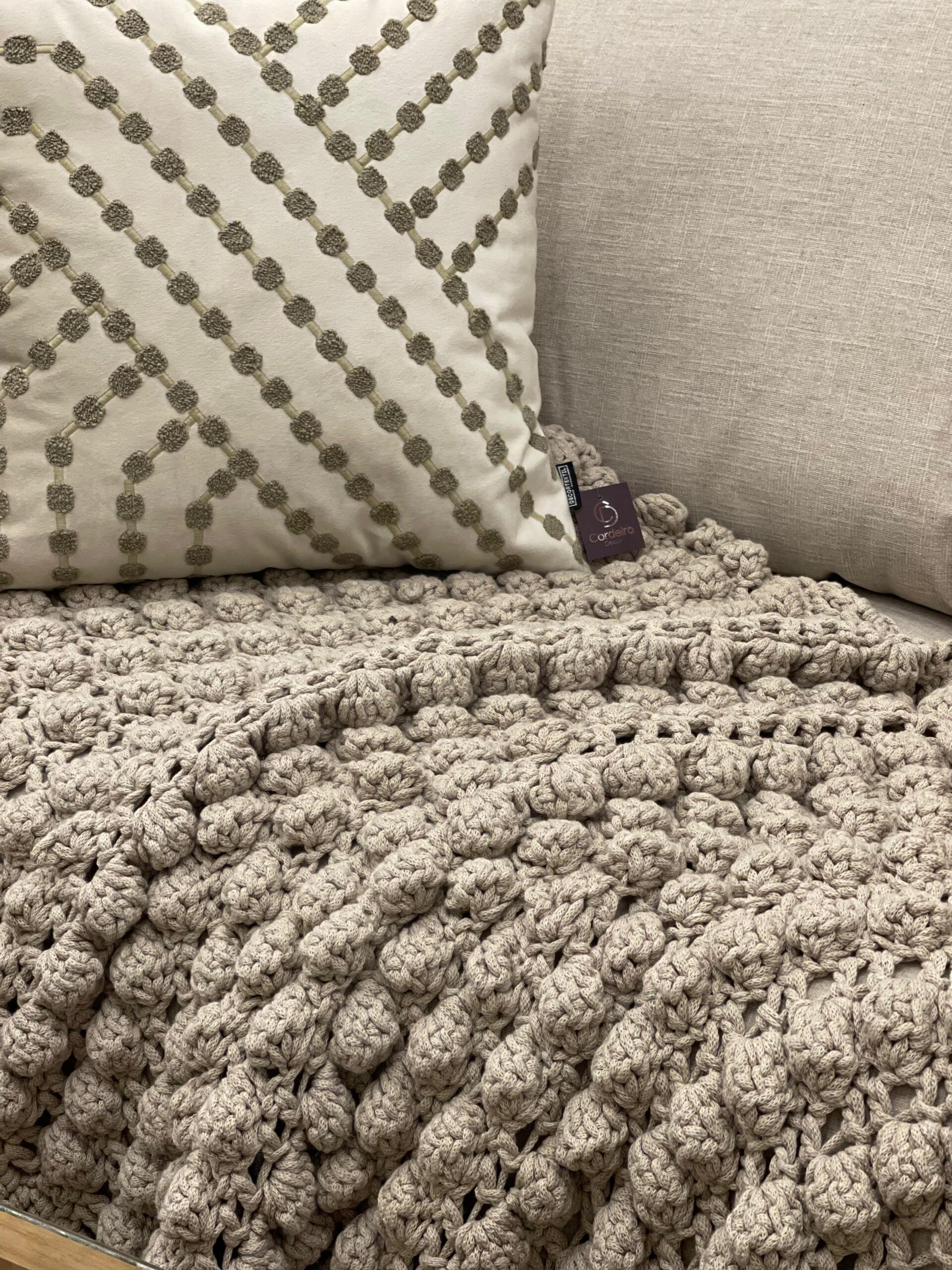 Manta em fio de malha artesanal, com trama encorpada e volumosa que transmite aconchego imediato ao ambiente. Seu tom neutro realça a textura feita à mão, valorizando o design rústico e ao mesmo tempo sofisticado. Além de aquecer, é um item de destaque na decoração, perfeito para sobrepor em sofás, poltronas ou camas, criando composições acolhedoras e cheias de personalidade.