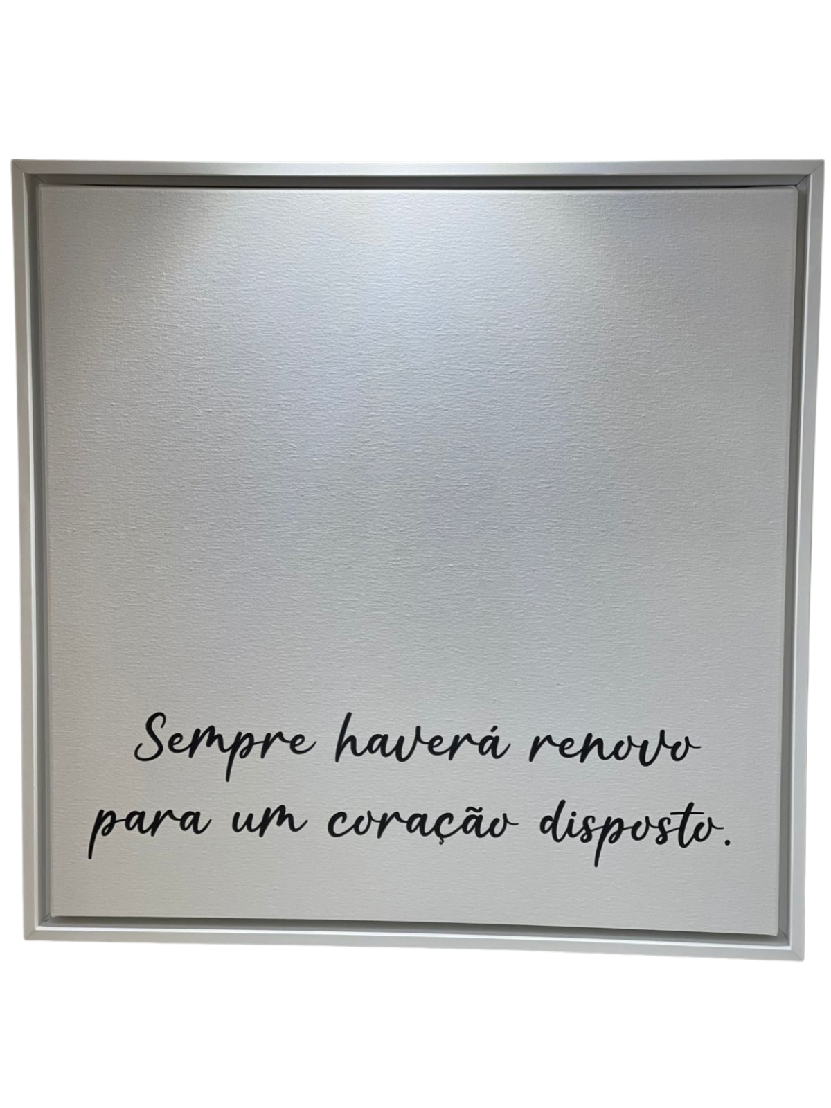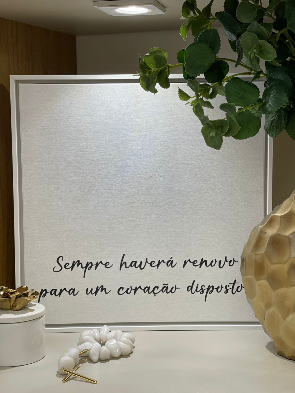 Este quadro traz uma mensagem de encorajamento e fé, ideal para quem busca um lar com significado e leveza. Produzido em canvas, sua superfície tem acabamento fosco e elegante, com moldura em madeira pintada de branco que complementa a proposta minimalista e serena da peça. A frase, escrita em tipografia fluida, é o destaque central, reforçando sentimentos de renovação e esperança no ambiente.