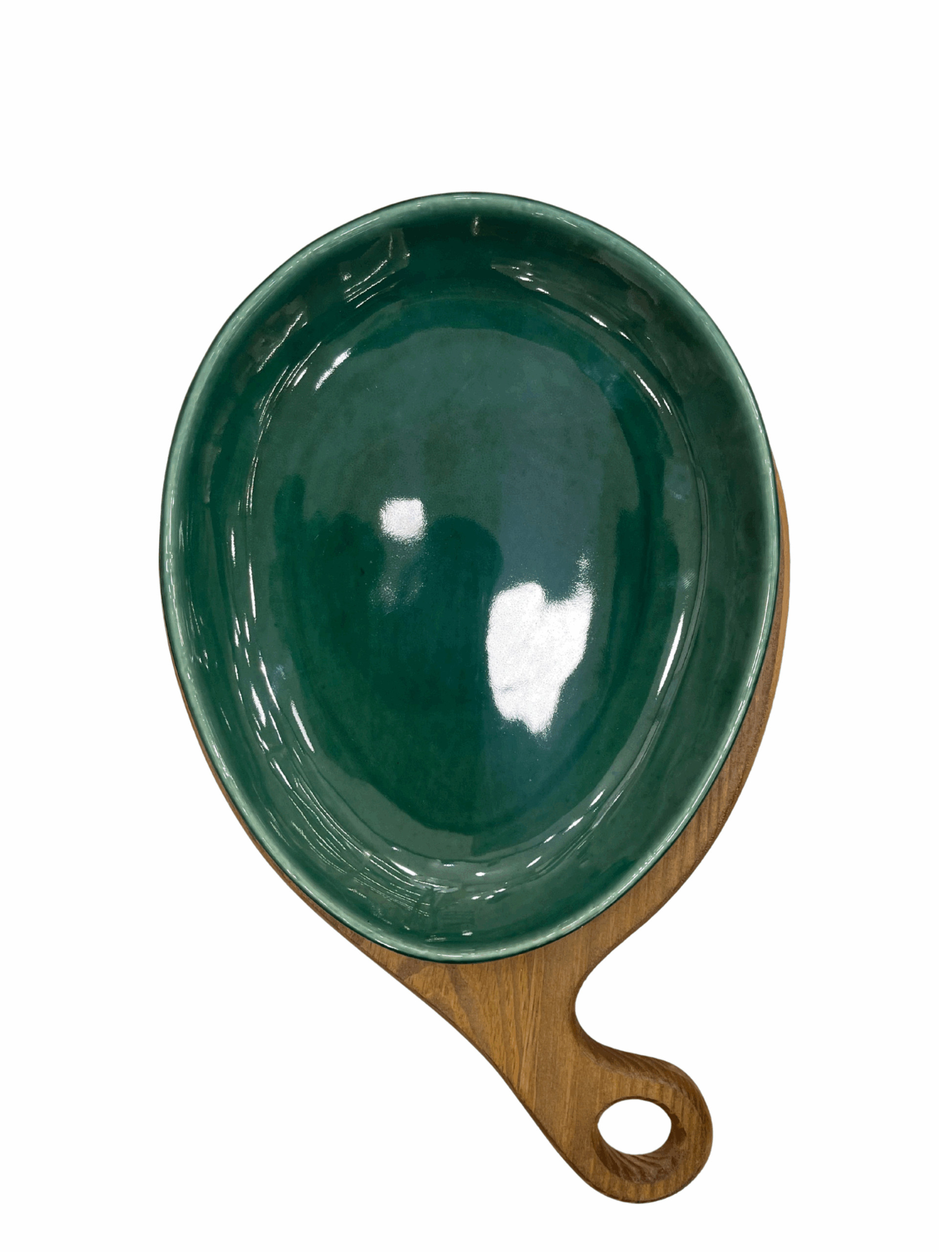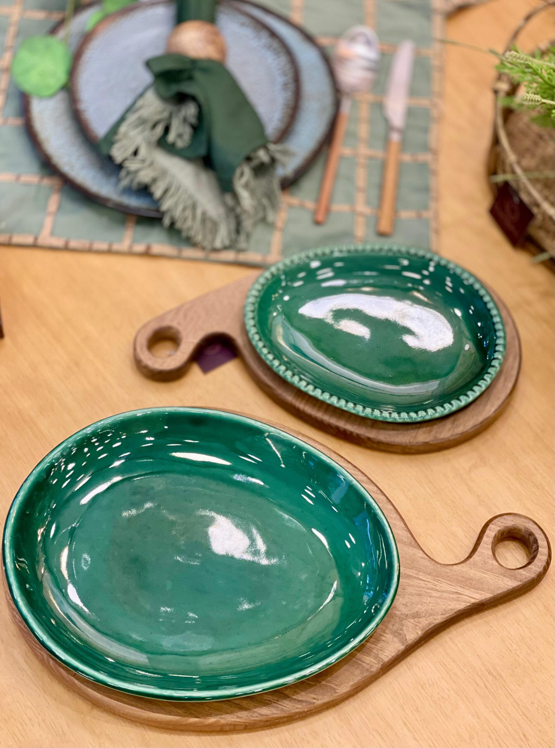 A versão G da nossa tábua oval em madeira vem acompanhada de um prato cerâmico verde mais amplo, com design liso e elegante. Uma peça que oferece praticidade sem abrir mão da estética, ideal para servir porções maiores ou montar uma mesa mais completa. O prato encaixa-se perfeitamente sobre a base em madeira, criando um conjunto harmonioso que valoriza desde refeições cotidianas até eventos especiais. Seu estilo rústico e sofisticado transforma o momento de servir em uma experiência acolhedora e cheia de charme.